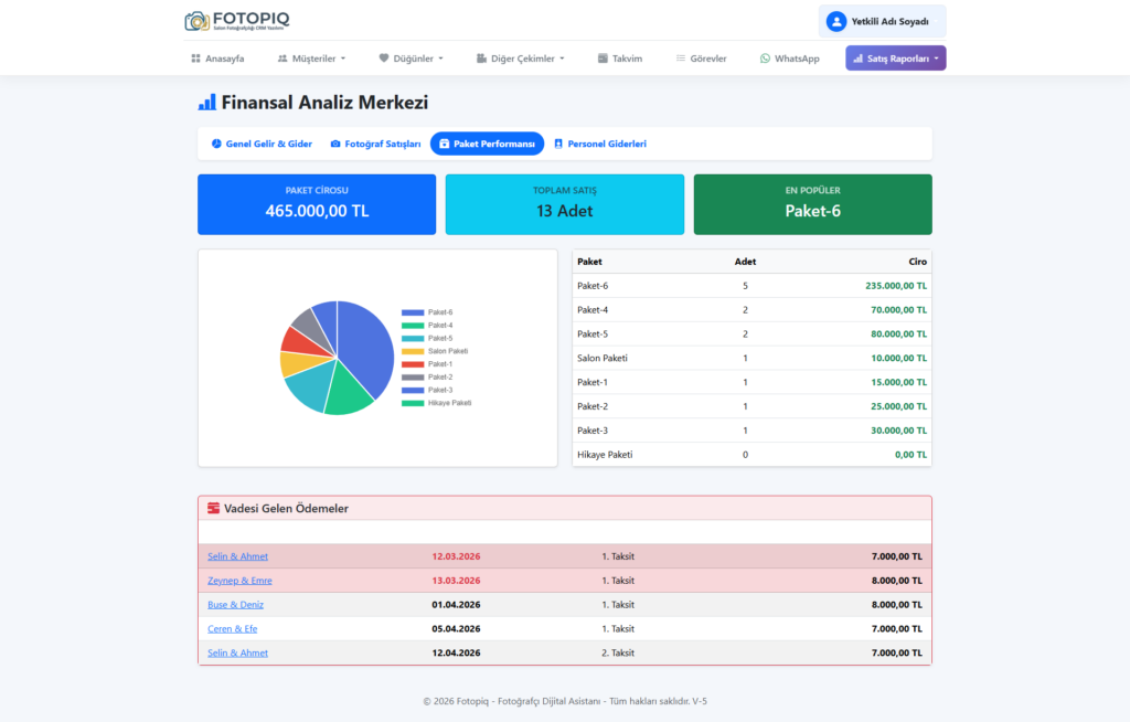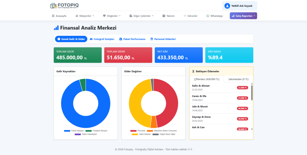 5 Kademeli Vade Takibi: Ödemeyi parçalara bölün (Kapora, Çekim Günü, Albüm Teslimi vb.). Her vade yaklaştığında dashboard’da kırmızı alarm yanar.